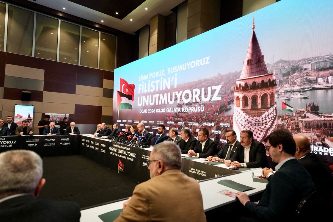 Konuşmasının devamında 1 Ocak 2026’da geçen yıllarda olduğu gibi bir etkinlik için değil; savunmasız çocuklar, çaresiz kadınlar, iradesine ipotek koyulmuş Gazze ve soykırıma uğramış bir halk için bir araya geldiklerini ifade eden Genel Başkan Yalçın, “Bu konudaki şahitliğimizi dünyaya bir kez daha göstermek, Filistin ve Gazze’ye nefes aldırarak irademizi tüm dünyaya yansıtmak üzere 1 Ocak tarihinde sabah 8.30’da herkesi Galata Köprüsü’ne bekliyoruz” dedi.