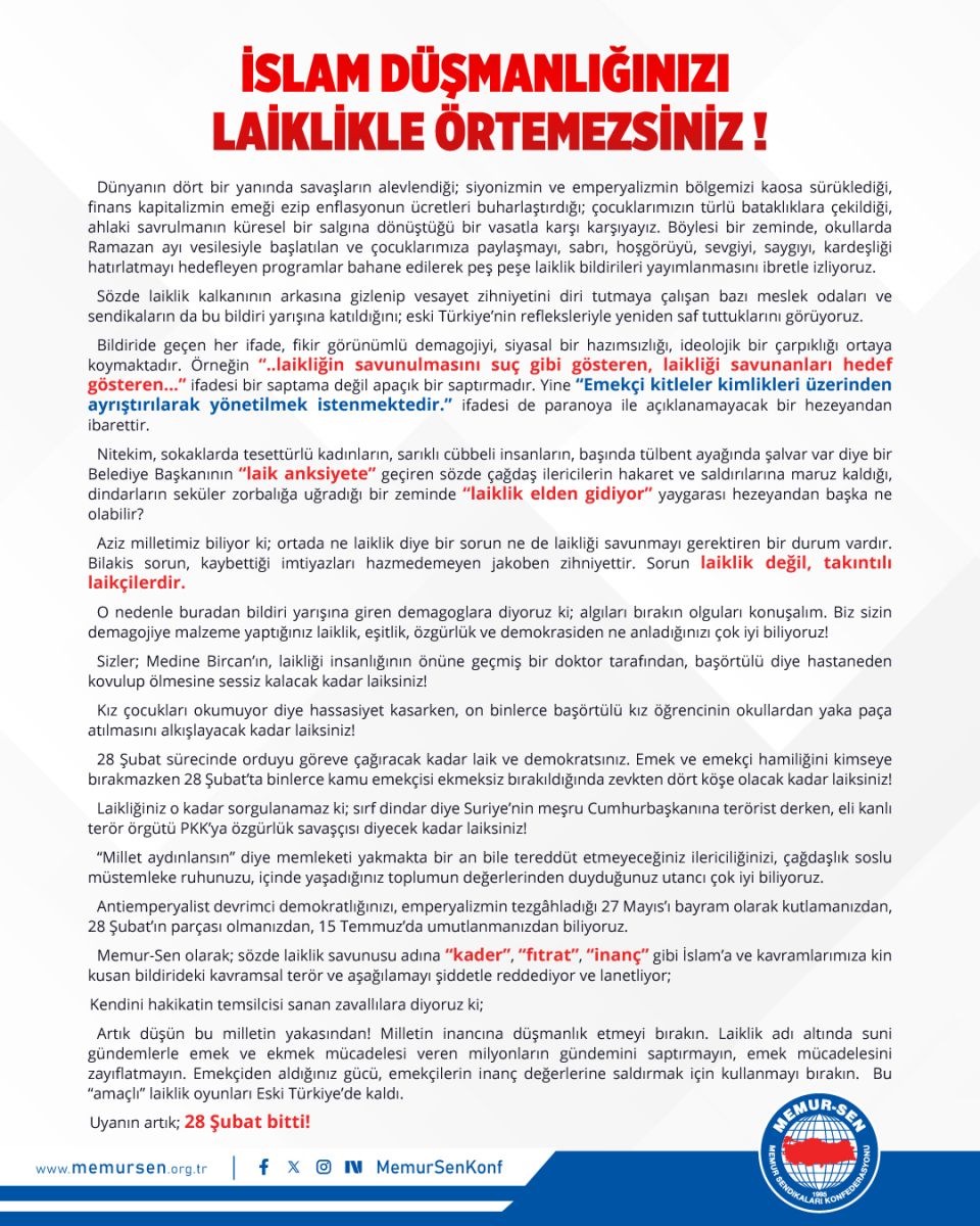 Memur-Sen olarak; Sözde laiklik savunusu adına “kader”, “fıtrat”, “inanç” gibi İslam'a ve kavramlarımıza kin kusan rapordaki teorik terör ve aşağılamayı reddediyor ve lanetliyor;
